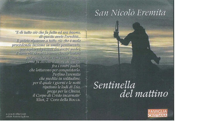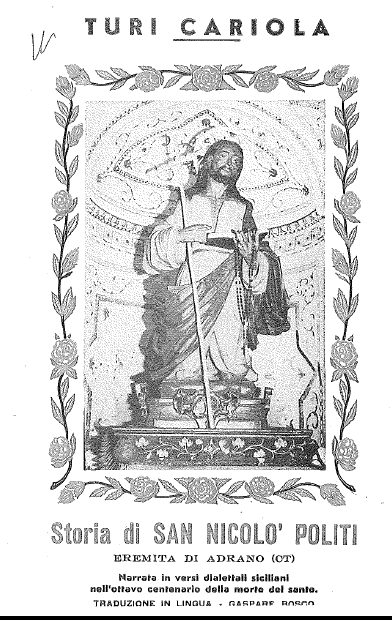 Ulteriori approfondimenti da quanto utilizzato da Santo Alì nel suo libro BIBLIOGRAFIAAmari Michele - Storia dei Mussulmani di Sicilia – Seconda edizione - Volume Terzo - parte prima. Amari Michele – Biblioteca Arabo Sicula – Edizione Dafni 1982. Amico Vito – Dizionario Topografico Della Sicilia – Tradotto dal latino e annotato da Gioacchino Di Marzo. Tipografia di Pietro Morvillo - Palermo 1855 - Volume primo. Artino Nicola cappuccino “San Nicola Politi Eremita”- Edizione Paoline - Catania. Bollandisti “Acta Sanctorum” Augusti - tomo III - pagg. 513-116. Bua sac. Angelo – Cenni Biografici di S. Nicolò Politi eremita d’Adernò. Buscemi Benedetto - San Nicolò Politi e le sue Città. Cosmani Theologi – In Divum Nicolaum Eremitam Hymnus Di-Blasi Giovanni E.- Storia del regno di Sicilia – Stamperia Oretea - Palermo 1844. Fazello Tommaso - Della Storia di Sicilia - Tipografia Giuseppe Assenzio - Palermo 1817. Filangeri Camillo - Monasteri Basiliani di Sicilia. Caietano Octavio - Animadversiones In Vitam Sancti Nicolai Eremitae. Caietano Octavio - Animadversiones In Imnum Sancti Nicolai Eremitae. Caietano Octavio -Vita Sancti Nicolai Adernionensis Eremitae. Lynn White Townsend, jr. - Il monachesimo latino nella Sicilia normanna - Editrice Dafni – Catania. Malaterra - Tomo 5 - I parte - 2a ed. - Edizione Pontieri 1927. Norwich John Julius – I Normanni nel Sud 1016-1130 - Ediz. Mursia. Oriti G. - S. Nicolò Politi protettore della città di Alcara Li Fusi – Tipografia “Dante Alighieri” - Riposto 1914. Pecchioli Arrigo - Il Regno di Sicilia - Editalia 1994. (albero geneologico) Petronio Russo sac. Salvatore – Illustrazione Storico-Archeologica di Adernò – Tipografia editrice Giuseppe Gemma. Petronio Russo sac. Salvatore– Della Vita e del Culto di S. Nicolò Politi Eremita. Pirro Rocco - "Catanensis Ecclesiae -Hadranum-" Radice G. - II casale e l'abbazia di S. Maria di Maniace, in Arch. St. Rapisarda Rocco Enrico –Alzati e Seguimi – Edizioni O.V.E. - Catania 1967 Santangelo sac. Antonino - S. Nicolò Politi. Santangelo Nino – Adrano: Storia – Religione – Democrazia - Edizioni Esiodo 1994 Scaduto Mario – Il Monachesimo Basiliano Nella Sicilia Orientale - Edizioni di “Storia e Letteratura” - Roma 1982. Stazzone Giuseppe - Acqua Santa - Edizioni a cura del Comitato S. Nicolò Politi - 1993-1994. Surdi d. A. - “La vittoria della penitenza” (in copia fotostatica nell’archivio storico del castello di Adrano). Vauchez Andrè - Il Santo - La Civiltà Del Medio Evo – Storia e cultura - vol. 3. Documenti Branchina Pietro - Dattiloscritti A e B Branchina Pietro - Manoscritti. Onorato Colonna - "Adernò Redivivo" nelle memorie della fondazione della sua città - 1738. SCRITTI SACRI Lezionario della festa in onore del Santo. Sacra Bibbia ATTI PUBBLICI 25 giugno1696 - Atto pubblico, rogato dal notaio Pietro Anastasio: gli Adornesi eleggono il Santo a loro protettore e compatrono assieme a San Vincenzo. 12 marzo – 5a indizione 1742 - Atto pubblico del notaro Giovanni Morabito di Adernò: il nostro Santo con-cittadino viene riproclamato “Patrono di Adernò”. 17 Agosto 1933 - Atto pubblico rogato dal segretario generale comunale: viene dato dal comune alla chiesa di S. Nicola il terreno demaniale adiacente all’eremo e altro terreno per costruirsi una strada che con-duce alla grotta. 17 dicembre 1926 - Atto di compravendita del notaio Vincenzo Spitaleri a favore del prev. Pietro Branchina e sac. Angelo Bua contro Caruso Concetta fu Pietro: compravendita terreno “Aspicuddu” con il primo rifugio del Santo. |