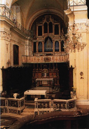 La parete è composta da otto spicchi, uno di questi costituisce l'ingresso. Negli spicchi successivi è collocata la cantoria di fattura molto antica, come risulta dall'incisione: "HOC-OPUS-FECIT-MAGISTER-IOSEPIN-VANARIA-1664".