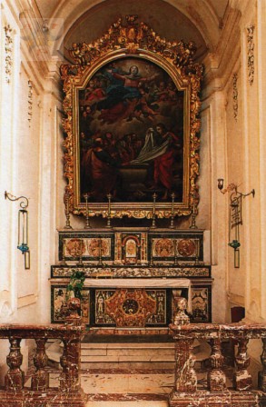 nell'altare posto a destra segnaliamo, come caratteristica delle mensole lignee che, riproducendo in pittura la colorazione del marmo, prolungano la mensola di quest'ultimo fino al muro.