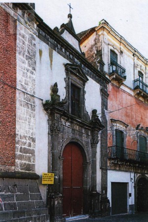 Il grande portale in pietra lavica, costituito da una coppia di colonne sormontate da modanature, che raccordano l'ampia finestra superiore, costituisce l'unico elemento caratterizzante il prospetto della chiesa vera e propria che si stacca dall'edificio alla sua destra per mezzo di una semplice parasta anch'essa in conci di pietra lavica. Alla sinistra la mole del campanile sovrasta dall'alto dei suoi tre partiti la Chiesa. Questo è realizzato sua pianta quadrangolare ed è coperto da una volta conica. Il corpo dei servizi parrocchiali, di recente costruzione, disturba l'immagine del capanile sul fianco della Chiesa.