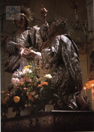 Questo gruppo rappresenta il Cristo che dà le chiavi a S. Pietro. E' desunto dall'affresco del Perugino nella parete a destra di chi entra nella Cappella Sistina. Questo gruppo in rilievo supera l'originale in pittura del grande artista. Le teste in legno lavorate a Roma. La veste dei due personaggi è d'argento e l'arte della loro realizzazione supera la ricchezza del metallo con il quale sono fatte. Quest'opera risale alla fine del '700, per munificenza della dottoressa Pisani. Il mezzo busto con la testa in argento dello stesso Apostolo, che ha nel petto l'insigne reliquia (la rotella del ginocchio) è un lavoro che rimonta a due secoli prima del magnifico gruppo.