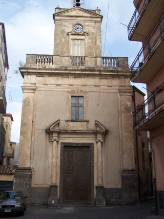 La Chiesa, che presenta una facciata campanile, è caratterizzata da uno zoccolo di pietra lavica da cui si dipartono due lesene d'angolo che reggono una trabeazione conclusiva arricchita di triglifi. Sopra di essa trovasi una balaustra dalla quale si diparte un altro capo centrale a campanile con un'apertura centrale a timpano terminale.